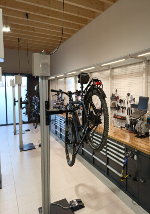Unsere Arbeitsplätze verfügen über professionelles Equipment, sowohl für die Mitarbeiter, als auch für Ihr E-Bike. Unsere Mitarbeiter werden regelmäßig durch die entsprechenden Fachschulungen auf den neuesten Stand der Technik weitergebildet. Selbstverständlich sind wir auch ein Ausbildungsbetrieb des Handwerks.